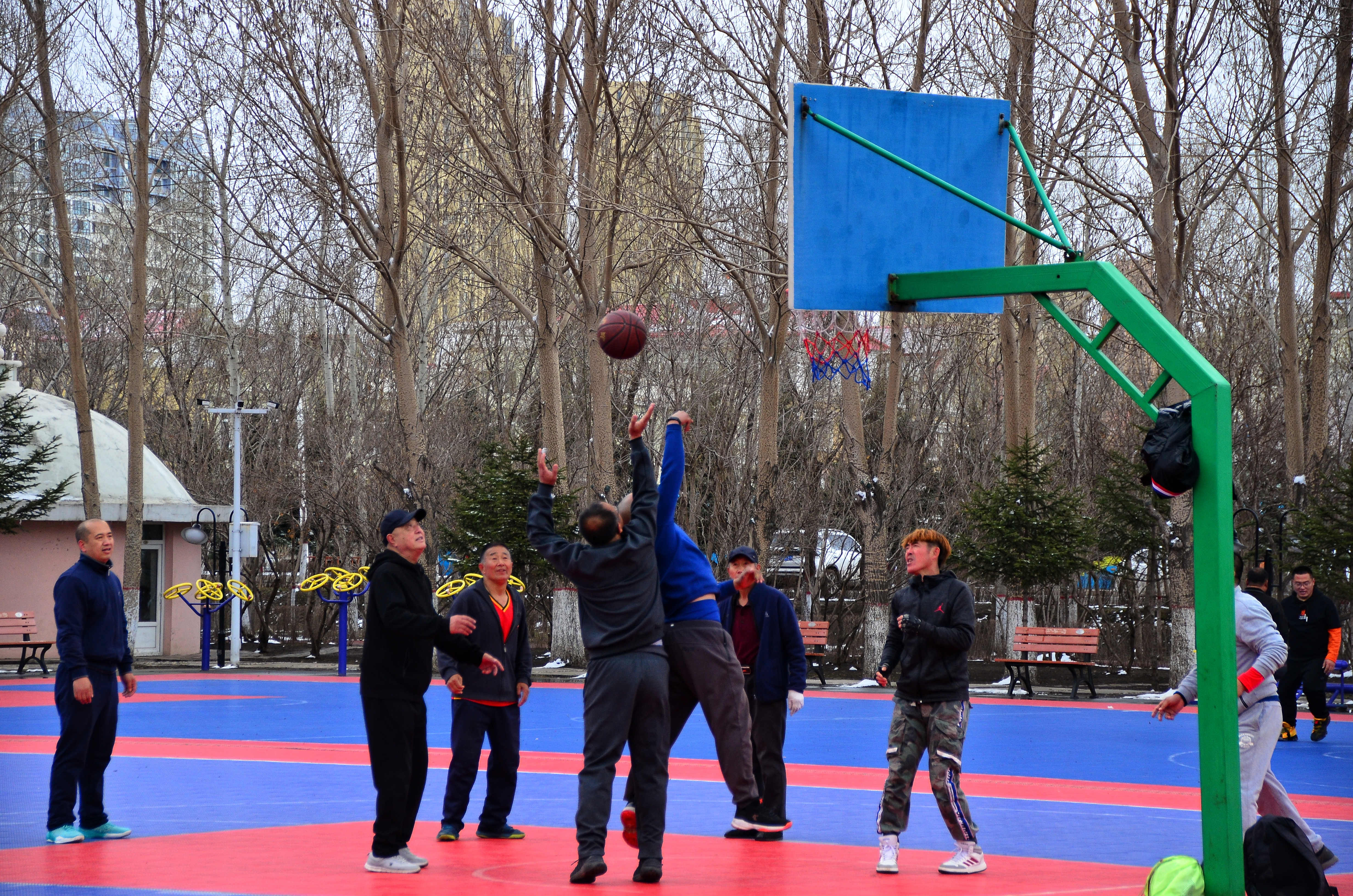 市民在新區(qū)中心公園打籃球