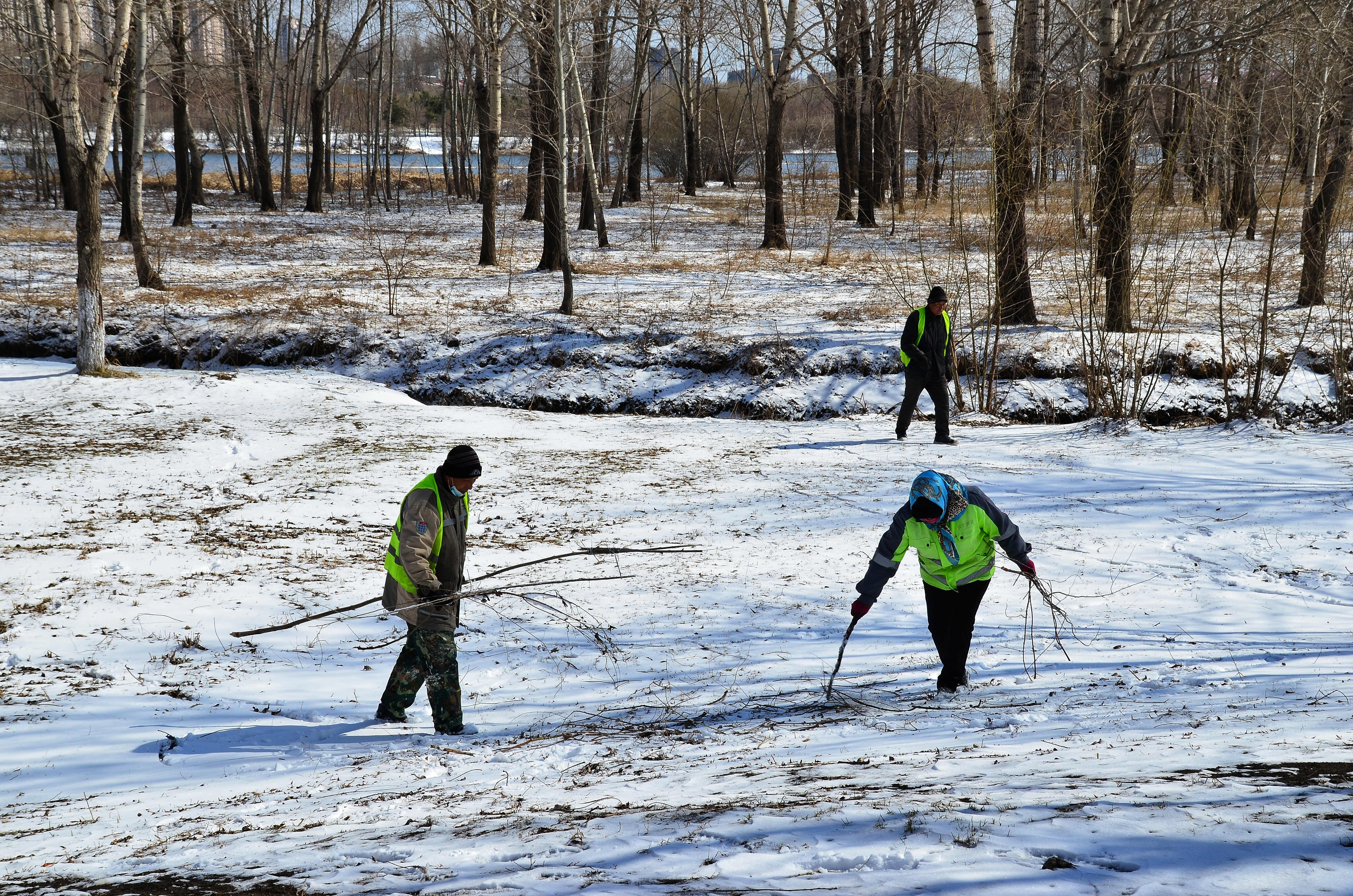 哈爾濱文化中心公園的工作人員在撿枯枝