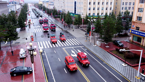 在漠河市城區(qū)主要街道,由防火指揮車(chē)、防火宣傳車(chē)、防火運(yùn)兵車(chē)等33臺(tái)車(chē)輛組成的反思巡游車(chē)隊(duì),長(zhǎng)鳴防火警報(bào),繞市區(qū)緩慢行駛,通過(guò)聲勢(shì)浩大的宣傳,警醒廣大居民群眾以史為鑒,深刻反思“五?六”火災(zāi)帶來(lái)的慘痛教訓(xùn),讓森林防火時(shí)刻深入人心,嚴(yán)防森林火災(zāi)發(fā)生。在漠河市區(qū)開(kāi)展巡游活動(dòng)的同時(shí),各鎮(zhèn)也同步組織開(kāi)展了規(guī)模不同的“五·六”反思警示教育活動(dòng)。