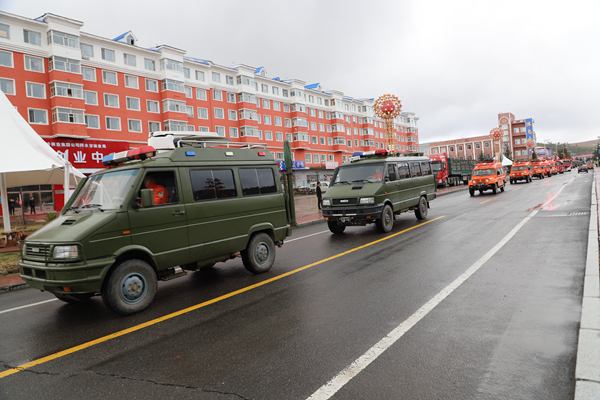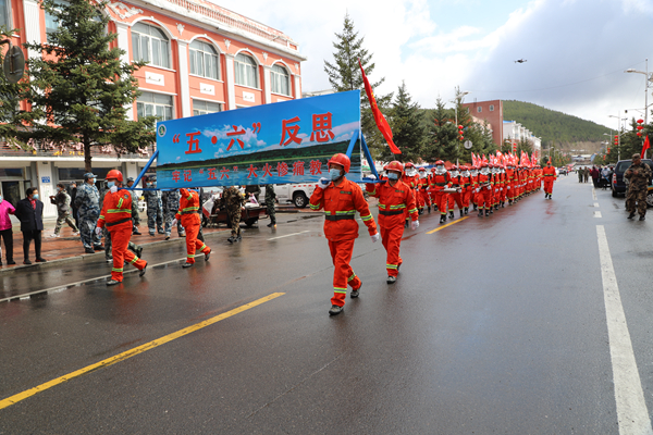 9時,反思活動正式開始。林業(yè)局處級領(lǐng)導(dǎo)與職工群眾鄭重地在在“牢記歷史 汲取教訓(xùn) 振奮精神 開拓進(jìn)取 建設(shè)美麗藍(lán)莓小鎮(zhèn)”宣傳條幅上,鄭重地簽上了自己的名字。并舉行了聲勢浩大的人員游行、車輛游行。由運兵車、運兵車、人工增雨車等26臺特種車輛,拉響警報,緊跟在由森林消防大隊組成的100余人步行方陣后,他們身穿防火戰(zhàn)斗服,手舉寫有“‘五?六’反思”巨型防火宣傳牌和防火宣傳彩旗,尤其是手執(zhí)高速渦流噴射滅火機、脈沖槍、斯蒂爾風(fēng)力滅火機的隊員,邁著整齊的步伐,喊著響亮的口號,立即吸引了過往的居民的注意,成為最亮眼的“明星”。