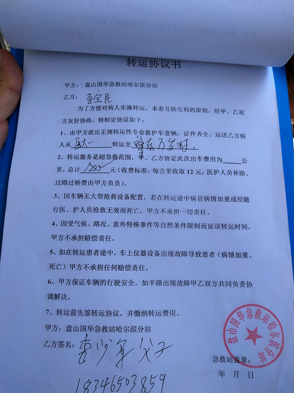 記者詢問(wèn)了其中一名駕駛員車輛的相關(guān)手續(xù)和單位的資質(zhì),對(duì)方表示不清楚,他們只是司機(jī),負(fù)責(zé)開(kāi)車,一個(gè)月工資3000元錢,公司指派去哪接人送到哪,他們就按照指示去做。記者又問(wèn)到:你們是怎么收費(fèi)的?最遠(yuǎn)去到哪?車上有沒(méi)有醫(yī)護(hù)人員?對(duì)方說(shuō)最遠(yuǎn)就是呼蘭,沒(méi)出過(guò)哈市,收費(fèi)就是按照公里數(shù)收費(fèi)。隨后工作人員在車?yán)镎业搅宿D(zhuǎn)運(yùn)協(xié)議書(shū),其中一張顯示車輛從醫(yī)大一院轉(zhuǎn)運(yùn)至肇東市,收取費(fèi)用是1200元(收費(fèi)標(biāo)準(zhǔn):每公里收取12元,醫(yī)護(hù)人員補(bǔ)助、過(guò)路過(guò)橋費(fèi)由甲方負(fù)責(zé))。針對(duì)此情況,由于不確定車輛是否具備營(yíng)運(yùn)資質(zhì),需要和遼寧還有患者家屬方面核實(shí),所以將車輛的相關(guān)證件暫扣。