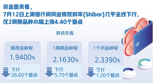 資金面來(lái)看,7月12日上海銀行間同業(yè)拆放利率(Shibor)幾乎全線下行,僅2周期品種小幅上漲4.40個(gè)基點(diǎn)。具體來(lái)看,隔夜品種報(bào)1.9400%,下行26.60個(gè)基點(diǎn);1周期品種報(bào)2.1630%,下行5.70個(gè)基點(diǎn);1個(gè)月品種報(bào)2.3390%,下行1.20個(gè)基點(diǎn)。