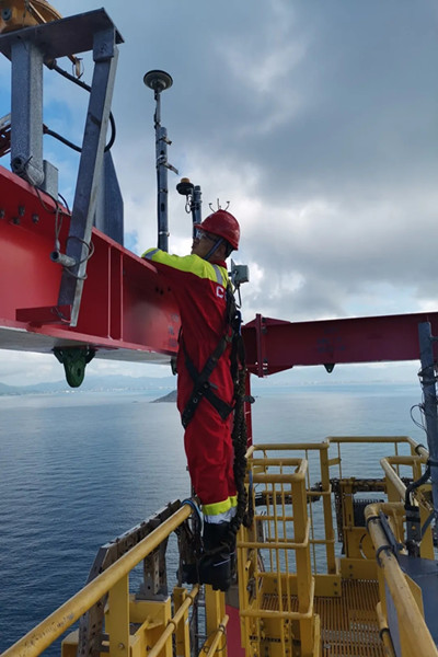 一次在進行天線布設(shè)時,平臺因遭遇較大的海風而劇烈搖晃,為了盡快完成設(shè)備布設(shè),成員努力保持身體平衡,在平臺井架頂部工作近 5 個小時,直到夜幕降臨才返回平臺上?!霸诤I吓赖桨倜赘叨葧r,我們真正體會到‘高處不勝寒’,但是大家還是克服了恐懼,堅持完成任務(wù)。”何東旭說。