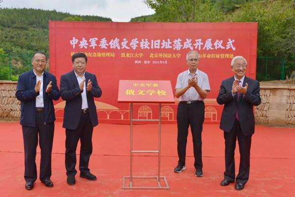 延安革命紀(jì)念地管理局黨委書(shū)記薛耀軍、黑龍江大學(xué)黨委書(shū)記王永清、北京外國(guó)語(yǔ)大學(xué)校友總會(huì)會(huì)長(zhǎng)楊學(xué)義工、中央軍委俄文學(xué)校校長(zhǎng)曾涌泉之子曾建為中央軍委俄文學(xué)校舊址展覽揭牌。