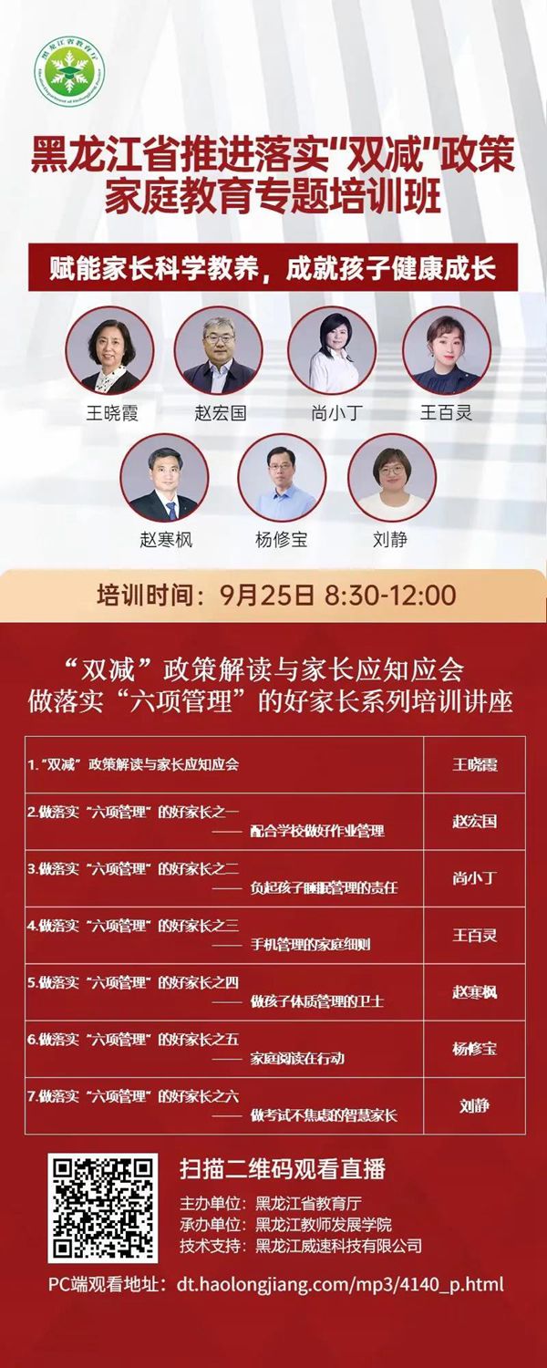據(jù)了解,此次培訓(xùn)是《黑龍江省中小學(xué)“百萬家庭賦能”工程實(shí)施方案》重要組成部分,也是省教育廳踐行黨史學(xué)習(xí)教育“我為群眾辦實(shí)事”,解決群眾急難愁盼問題的具體舉措,由省教育廳主辦、黑龍江教師發(fā)展學(xué)院承辦,基礎(chǔ)教育處處長領(lǐng)銜六位家庭教育專家共同開講,時(shí)長三個(gè)半小時(shí),受到廣大家長的一致好評(píng),取得良好的社會(huì)反響,直播時(shí)瀏覽峰值達(dá)到210.7萬人次。培訓(xùn)內(nèi)容緊緊圍繞廣大家長們“雙減”形勢下的困惑,深入宣傳“雙減”政策和年初以來教育部相繼下發(fā)的關(guān)于手機(jī)、作業(yè)、睡眠、讀物、體質(zhì)、考試等“六項(xiàng)管理”文件內(nèi)容,分七個(gè)專題進(jìn)行深入細(xì)致的家庭教育指導(dǎo),有的放矢地解答家長“心中所疑”、化解家長“心中所急”,很多家長通過家庭學(xué)校群進(jìn)行交流,有的家長反饋道:“通過觀看直播我們家長深刻體會(huì)到一定要以身作則,在孩子面前少玩手機(jī),多陪孩子閱讀書籍,多讓孩子進(jìn)行戶外活動(dòng)。”有的家長則表示,聽了講座深刻理解了孩子成長的根基深植于家庭教育的道理,家庭教育才是孩子的起跑線,主動(dòng)地配合學(xué)校落實(shí)“雙減”政策,從做好“六項(xiàng)管理”入手科學(xué)優(yōu)化家庭教養(yǎng)方式,減少孩子的校外培訓(xùn)和作業(yè)負(fù)擔(dān),還給孩子一個(gè)幸福的童年,做一名智慧家長。
