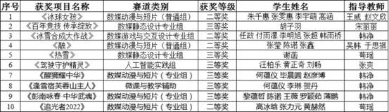 在參賽學(xué)生與指導(dǎo)教師的共同努力下,10項(xiàng)作品進(jìn)入國(guó)賽(包括大數(shù)據(jù)應(yīng)用組、人工智能實(shí)踐組、數(shù)媒動(dòng)漫與短片組、數(shù)媒靜態(tài)設(shè)計(jì)專業(yè)組、微課與教學(xué)輔助組、數(shù)媒游戲與交互設(shè)計(jì)組),最終喜獲全國(guó)二等獎(jiǎng)4項(xiàng),全國(guó)三等獎(jiǎng)6項(xiàng)。