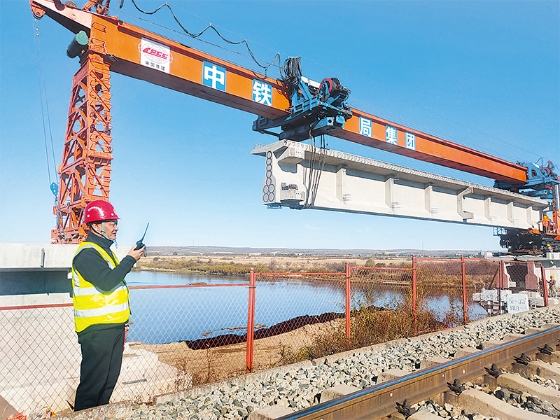據(jù)介紹,前不久北黑鐵路升級(jí)改造工程新建24座鐵路橋中的另一座孫吳段大河口中橋架梁已經(jīng)完成。橋梁位于孫吳縣境內(nèi),橋長(zhǎng)112.73米,孔跨布置為3×32米,下部結(jié)構(gòu)和T梁預(yù)制施工由中鐵十局完成,梁體架設(shè)由中鐵十六局集團(tuán)第五工程有限公司負(fù)責(zé)完成。