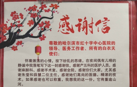 黑龍江經(jīng)濟(jì)網(wǎng)訊(孫麗霞 葉鴻 梁新立)“懷著激蕩的心情,按下紛亂的思緒,在夜間偶有兒啼的靜謐中我落筆寫下這一封感謝信……如果感謝也可以稱重,我想我的這一份,它將重逾山河?!苯眨枮I市紅十字中心醫(yī)院(哈爾濱醫(yī)科大學(xué)附屬哈爾濱婦產(chǎn)醫(yī)院)產(chǎn)五科收到了來自患者家屬李先生的一封感謝信和一面錦旗。