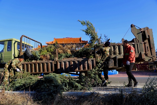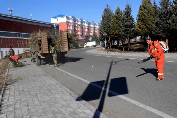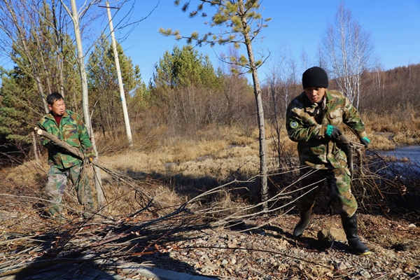 圖為阿木爾林業(yè)局森林消防大隊(duì)專業(yè)撲火隊(duì)員將修剪下來的樹枝裝車運(yùn)走(王力/攝)
