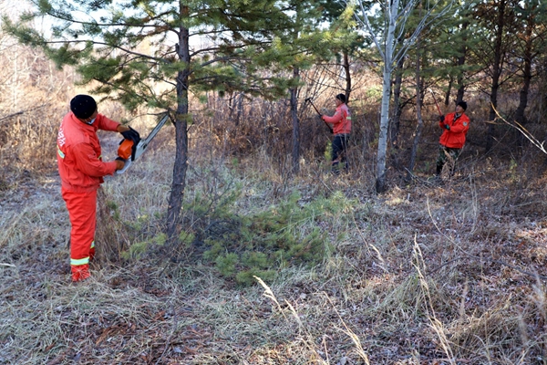 圖為阿木爾林業(yè)局防火辦黨總支黨員突擊隊(duì)帶領(lǐng)專業(yè)撲火隊(duì)員在修剪北極植物園樹枝(王力/攝)