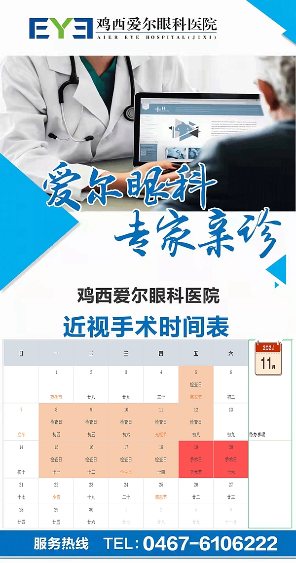 雞西愛爾眼科醫(yī)院近視手術(shù)時間表:
