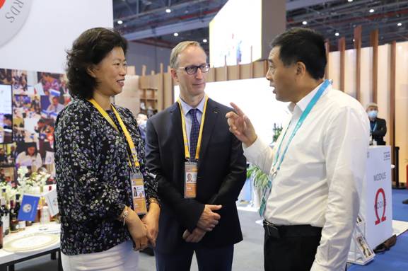 圖為大興安嶺林業(yè)集團(tuán)公司黨委副書記、總經(jīng)理李軍(左二)向法國(guó)參展企業(yè)推介北極冰藍(lán)莓酒莊紅酒系列產(chǎn)品(王力/攝)