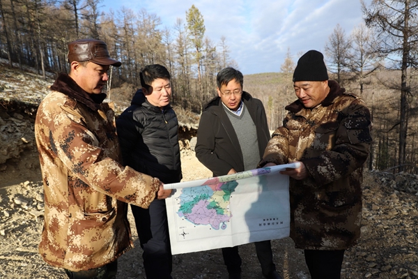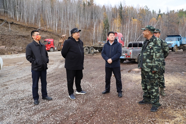 圖為阿木爾林業(yè)局黨委副書記、局長韓鳳泉(右二)深入到2—1線檢查新開通路線施工進(jìn)展情況(王力/攝)