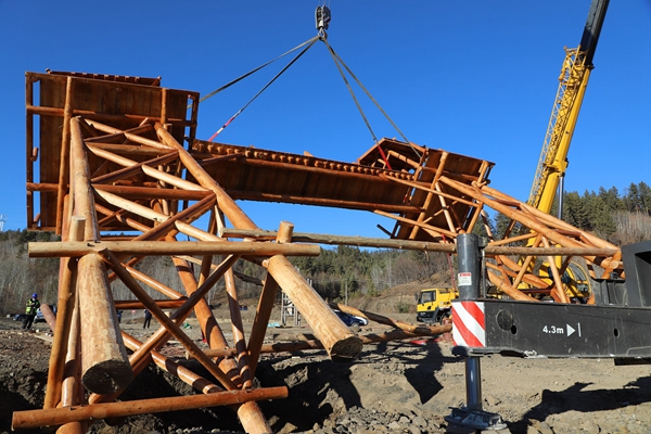 早上10點58分,只見平靜的林業(yè)局薩布素軍馬場頓時熱鬧了起來,兩臺大型起重機發(fā)動機嗡嗡作響,一東一西緩慢吊起10多噸重的大門,因偏向一側(cè)首次作業(yè)沒有成功。安裝技術(shù)人員調(diào)整重心點,第二次試舉,并在一臺裝載機的協(xié)助下,調(diào)整機位,歷時2個多小時,才將具有濃郁驛站文化風格的高10米、寬14米的木質(zhì)大門,矗立在平地上。