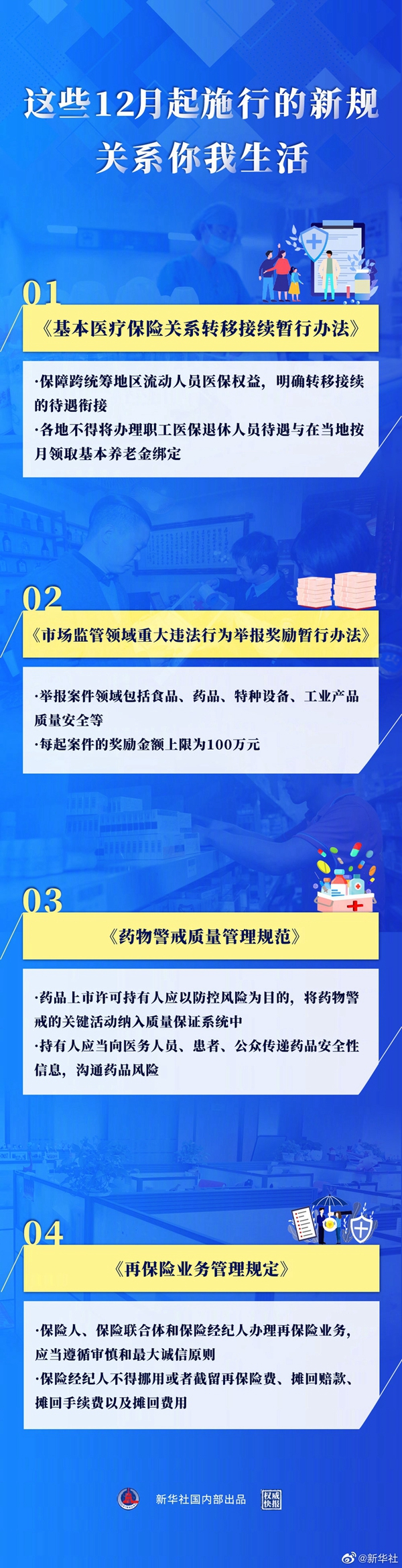 明確醫(yī)保關系的轉移接續(xù)辦法,讓跨統(tǒng)籌地區(qū)流動人員的醫(yī)保權益更有保障;舉報市場監(jiān)管領域重大違法行為可獲獎勵,每起案件的獎勵金額上限為100萬元;進一步完善藥物警戒質量管理規(guī)范,強化藥品上市許可持有人的安全監(jiān)管責任……戳大圖,哪條你最期待?(新華社記者白陽 海報設計張晨光)