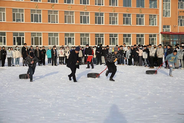 組織開(kāi)展拉輪胎跑比賽。拉輪胎跑比賽在各年級(jí)間進(jìn)行,每班6名選手,50米往返,以時(shí)間少者為勝。隨著裁判老師一聲令下,比賽開(kāi)始,選手們立馬拉起了輪胎奮力向前沖刺,克服雪地不利的條件,參賽選手飛快地向終點(diǎn)奔跑,掌聲、加油聲響徹操場(chǎng)。冬日的操場(chǎng)上,一個(gè)個(gè)