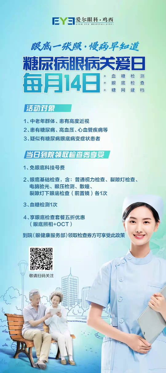 糖尿病作為嚴(yán)重的并發(fā)癥糖尿病視網(wǎng)膜病變,已成為成年人致盲的首要原因。為了加強(qiáng)糖尿病患者的宣傳和防治,提高公眾對(duì)糖尿病的防控,喚醒人們意識(shí),雞西愛爾眼科醫(yī)院將每月14日定為糖尿病眼病關(guān)愛日。當(dāng)天在該院就診的患者可享眼底基礎(chǔ)檢查、專家看診、血糖檢測、眼底檢查套餐五折優(yōu)惠等服務(wù),具體以下圖為準(zhǔn)。
