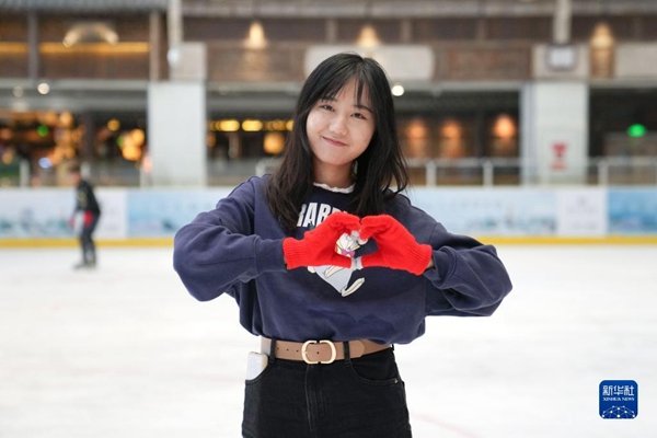 清華大學的學生志愿者王夢齡在清華大學“冬奧精神與青年志愿”課程上體驗滑冰(12月14日攝)。