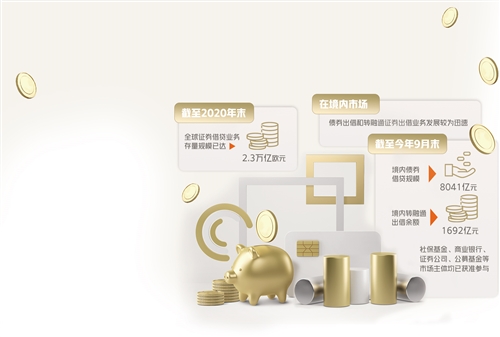 證券出借業(yè)務俗稱“融券”,是境內外資本市場提高二級市場流動性的常見交易制度,發(fā)展較為成熟。截至2020年末,全球證券借貸業(yè)務存量規(guī)模已達2.3萬億歐元。在境內市場,債券出借和轉融通證券出借業(yè)務發(fā)展較為迅速,截至今年9月末,境內債券借貸規(guī)模8041億元,境內轉融通出借余額1692億元,社?;稹⑸虡I(yè)銀行、證券公司、公募基金等市場主體均已獲準參與。