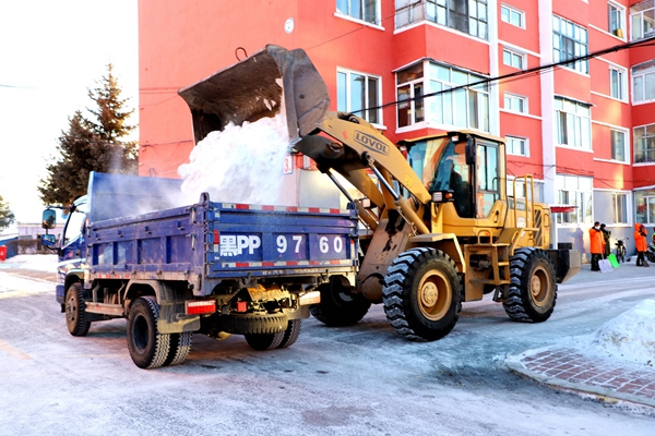鑒于此,林業(yè)局環(huán)衛(wèi)隊(duì)組織10多名環(huán)衛(wèi)工,出動(dòng)兩臺(tái)翻斗車、一臺(tái)裝載機(jī),對(duì)28棟居民樓房前的硬化地面積雪進(jìn)行“大掃除”,擴(kuò)大步行道面積,方便居民出行。