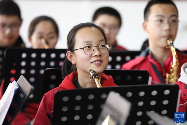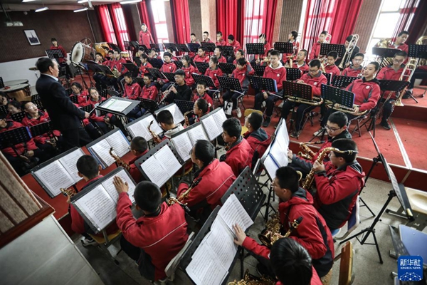 2022年寒假,在甘肅省白銀市會寧縣,會師中學(xué)交響管樂團的孩子們在完成寒假作業(yè)之余排練《紅旗頌》。早在2011年,會寧縣會師中學(xué)就東挪西借組建了第一個交響樂樂團。平時,學(xué)校為樂團的學(xué)生免費上樂器課,學(xué)生自愿報名參加、自愿購買小型樂器。如今,《紅旗頌》《長征組歌》等已成為樂團的保留曲目。