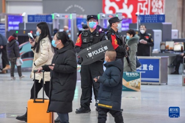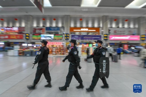 1月20日,在長(zhǎng)春火車站候車大廳,馬宇航(后中)與同事一起巡邏。