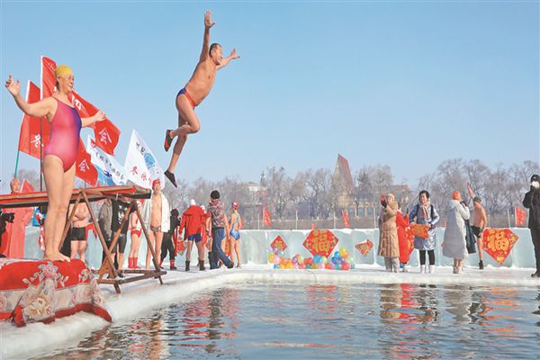 2月1日,正月初一。哈爾濱市冬泳協(xié)會的幾十位隊員,在會長張友慶的帶領(lǐng)下,以冬泳的方式,迎接壬寅虎年的到來。松花江上的冬泳場,披紅掛彩,貼上了福字。隊員們輪番從高臺、低臺上躍身而下,在江水中暢游。張友慶表示,大年初一,哈爾濱冬泳人響應(yīng)全民健身的號召,以冬泳的方式,積極參與到冰雪運動中來,以健康的身體、飽滿的精神,迎接北京冬奧會。