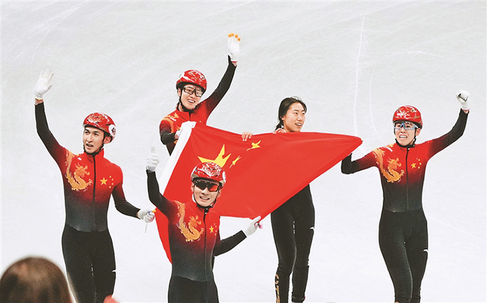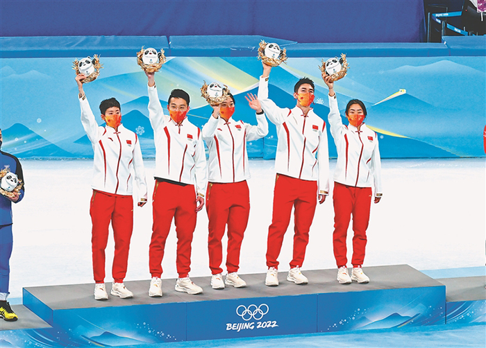 2月5日,中國隊(duì)選手在頒獎(jiǎng)儀式上。 黑龍江日報(bào)全媒體特派記者 郭俊峰攝