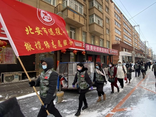 在北安,一走進(jìn)北安步行街,首先映入眼簾的是身著迷彩馬甲的退役軍人志愿者們,向沒佩戴口罩的市民免費(fèi)發(fā)放口罩,并主動(dòng)宣傳疫情防控知識(shí);頂著寒風(fēng),將步行街內(nèi)的積雪清理干凈,方便了市民的通行;幫助社區(qū)居民正確分類處置各類生活垃圾。這是北安市退役軍人服務(wù)中心、“橄欖綠”退役軍人志愿者服務(wù)隊(duì)正在踐行著幸福北安,文明有我。