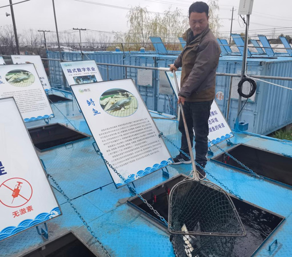 在良莊農(nóng)業(yè)科技園里,一排排藍(lán)色集裝箱,以及寫著“養(yǎng)殖箱體全程模擬自然生態(tài)環(huán)境,還您江湖魚的味道”等字樣的標(biāo)牌,別有一番趣味。記者了解到,這里是一個(gè)智慧漁場(chǎng),裝滿水的集裝箱則是鱘魚、鱸魚、鯽魚等的“家園”,打開一個(gè)集裝箱的頂部,三五成群的魚兒在約15平方米的水里游來(lái)游去。