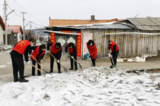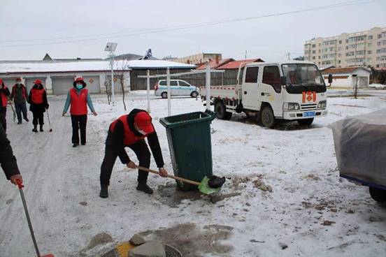 新林林業(yè)局機關科室“林海流星雨”志愿服務隊在居民區(qū)清掃積雪(崔紅霞 攝)