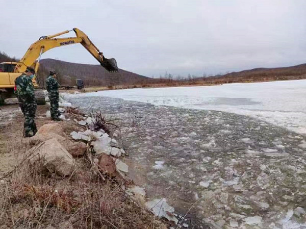 加格達(dá)奇林業(yè)局利用挖掘機(jī)開展破冰作業(yè)(趙子敬 攝)