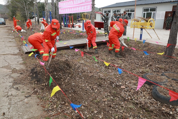 開設(shè)防火隔離帶,是阻擋火源的有效方法。依東林場(chǎng)將環(huán)境衛(wèi)生整治與防火科目結(jié)合起來,在門前擺下擂臺(tái),拉出橫線設(shè)立分區(qū),六組隊(duì)員進(jìn)入場(chǎng)地爭(zhēng)分奪秒、互不相讓,有的耙、有的裝,一會(huì)功夫一條干凈、規(guī)范的“隔離帶”出現(xiàn)在眼前。