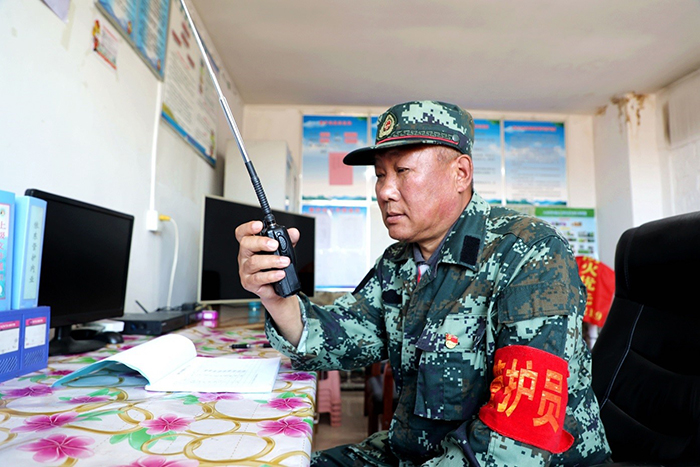共產(chǎn)黨員、管護(hù)員滿德江在向阿防指匯報工作情況。(王力 攝)