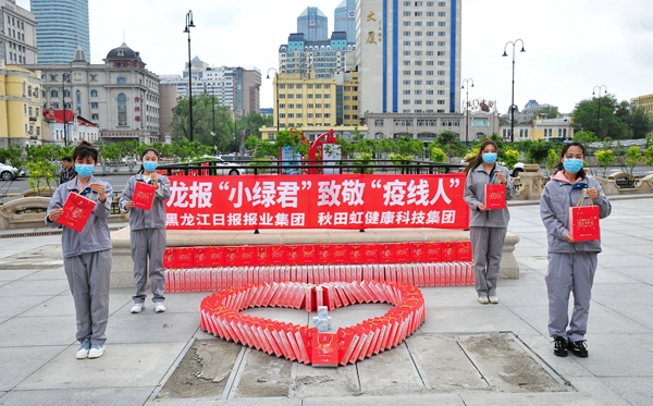 5月27日,由黑龍江日?qǐng)?bào)報(bào)業(yè)集團(tuán)和哈爾濱秋田虹健康科技集團(tuán)共同發(fā)起的“龍報(bào)‘小綠君’,致敬‘疫線人’”系列公益活動(dòng),在哈爾濱火車站南廣場(chǎng)正式啟動(dòng)。黑龍江日?qǐng)?bào)報(bào)業(yè)集團(tuán)、哈爾濱市委宣傳部、哈爾濱市公安局巡特警支隊(duì)、哈爾濱秋田虹健康科技集團(tuán)領(lǐng)導(dǎo)出席啟動(dòng)儀式。