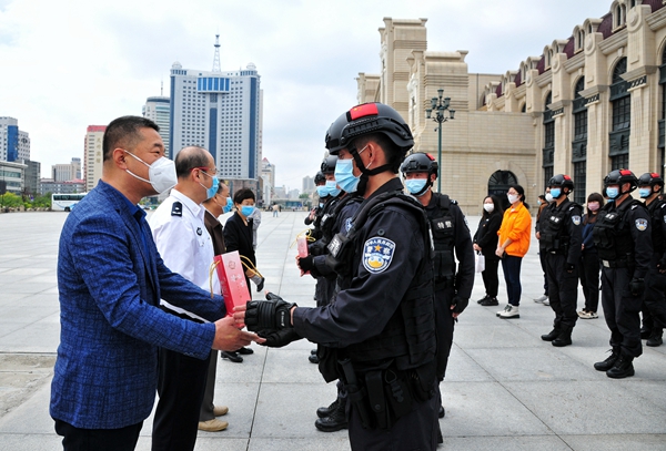 公益活動(dòng)首批慰問對(duì)象是剛從抗疫一線歸來的哈爾濱市公安局巡特警支隊(duì)隊(duì)員。本次疫情期間,他們馳援五常市拉林鎮(zhèn)、哈爾濱市平房區(qū)和賓縣,先后核查車輛3700余臺(tái),幫助群眾1100多人,為群眾配送餐食10萬余份、飲用水20余萬瓶、防疫物資9000余件,用血肉身軀筑起了抗擊疫情的鋼鐵長(zhǎng)城,詮釋了“疫情當(dāng)前,特警在先”的使命擔(dān)當(dāng)。“感謝黑龍江日?qǐng)?bào)報(bào)業(yè)集團(tuán)和愛心企業(yè)送來健康產(chǎn)品。今后我們會(huì)一如繼往做好本職工作,哪里需要哪里上,當(dāng)好人民的忠誠衛(wèi)士。”接過“小綠君”,哈爾濱市公安局巡特警支隊(duì)特警一大隊(duì)二中隊(duì)教導(dǎo)員劉甲洲一臉幸福。