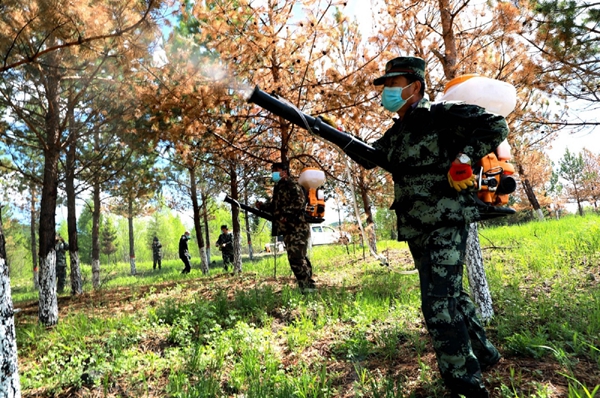 阿木爾林業(yè)局病防站利用噴霧噴粉機(jī)近距離對(duì)樟子松綠化樹(shù)木進(jìn)行病蟲(chóng)害防治(王力 攝)