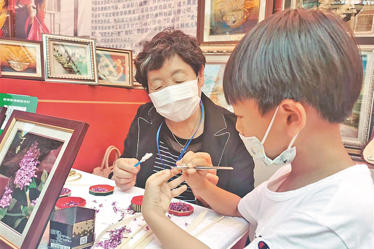 國家級非遺項目——麥稈剪貼技藝傳承人馬文俠教孩子制作紫丁香。黑龍江日報全媒體記者 荊天旭攝