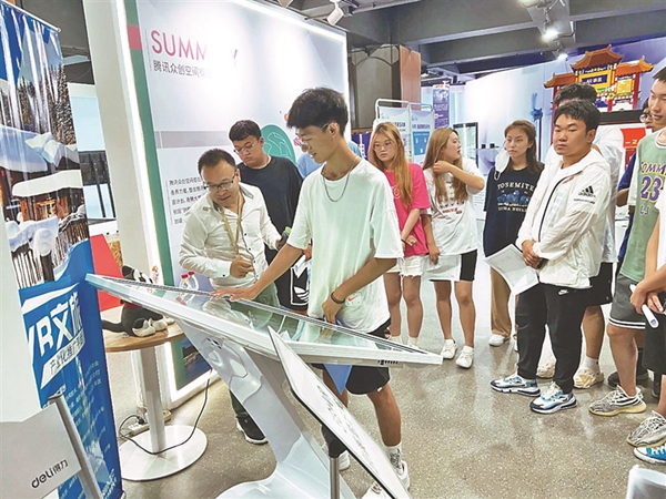 學(xué)生體驗(yàn)虛擬現(xiàn)實(shí)展品。