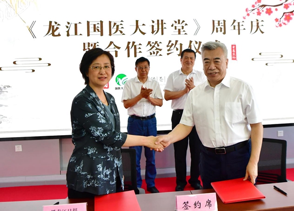 黑龍江日報報業(yè)集團黨委書記、社長張春姣與黑龍江省中醫(yī)藥科學院黨委書記、院長陳宏現場簽約