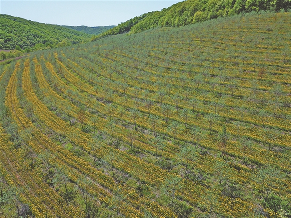 沿著公路,中藥材種植基地呈現(xiàn)一片花海:大片芍藥已經(jīng)開花,白的粉的隨風(fēng)飄搖;千畝黃芩都已經(jīng)3歲,仿佛綠蘿緞一直蔓延到遠(yuǎn)方的山坡;萬畝沙棘谷,更像一幅水墨畫,剛露頭的沙棘果盡顯萌態(tài);樹下間作的蒲公英盛開著黃色的小花;紫的泛黑的藍(lán)靛果吸引一群群鳥兒不停來啄食……