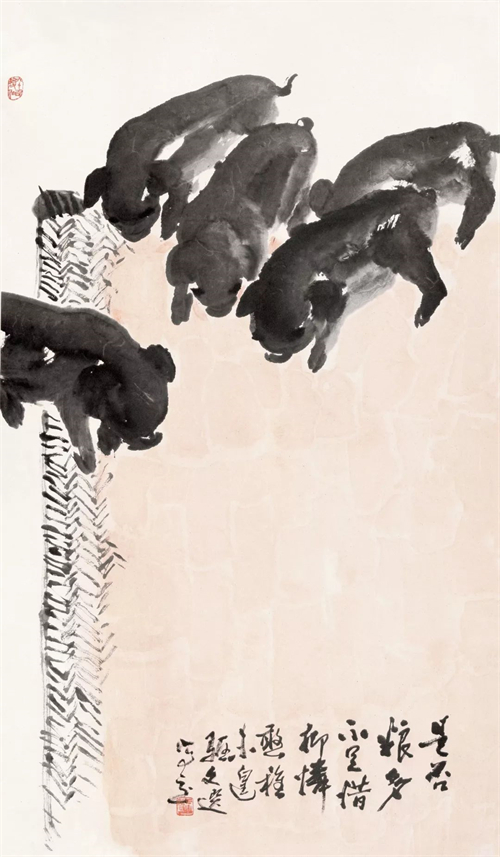 湯文選的人物、山水、花鳥、墨虎等一系列作品,融會著、貫穿著“三種傳統(tǒng)”?;螂[或顯,或化解之,或凝聚之,或熔裁之,或獨造之。“三種傳統(tǒng)”,可概括為現(xiàn)實主義在中國畫發(fā)展歷程中的三段式,亦曰交叉出現(xiàn)的不同歷史內(nèi)涵、文化反映的三種藝術(shù)狀態(tài):首先,是古代現(xiàn)實主義傳統(tǒng)——“外師造化,中得心源”。其二,是“五四”現(xiàn)實主義傳統(tǒng)——融合西法,崇尚寫實。其三,是新中國成立后倡導(dǎo)的革命現(xiàn)實主義傳統(tǒng)。深入火熱斗爭,深入工農(nóng)兵。學(xué)習(xí)延安木刻,學(xué)習(xí)民間年畫,學(xué)習(xí)蘇聯(lián)油畫現(xiàn)實主義的創(chuàng)作方法(50年代)。其后,“一手伸向生活,一手伸向傳統(tǒng)”(60年代)。在以上“三種傳統(tǒng)”的交匯點上,伸延出湯文選早期和中期的現(xiàn)實主義創(chuàng)作之路。湯文選中國畫藝術(shù)的現(xiàn)實主義,其主要特征為積極的入世態(tài)度,強(qiáng)烈的人文主義色彩,個性、民族性與時代性的完美統(tǒng)一,以及嚴(yán)肅的歷史使命感。