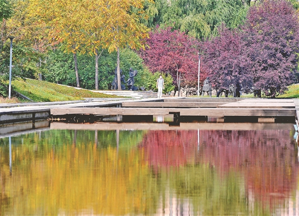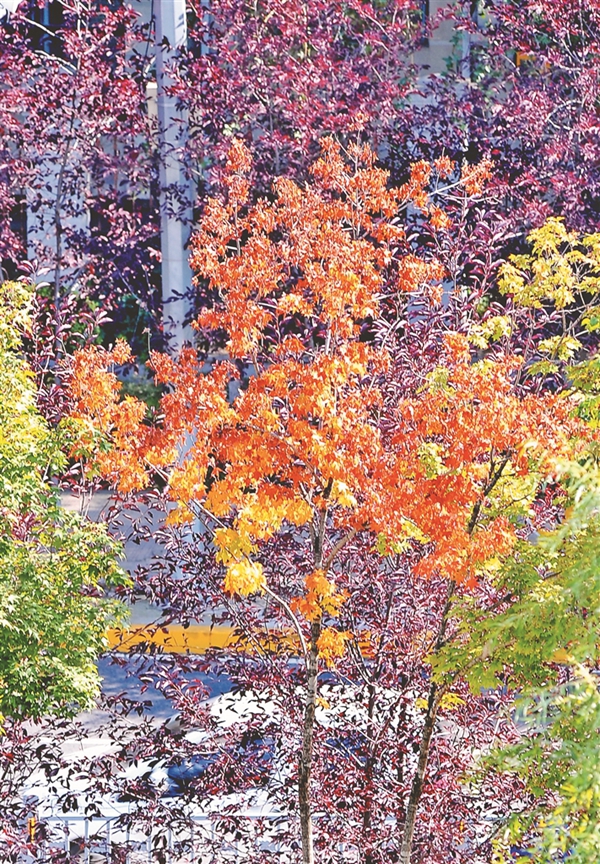 13日,哈爾濱市道里區(qū)景江東路附近的綠化帶里,一些樹葉開始變色,紅的、黃的、綠的,構(gòu)成了一幅美麗的圖畫,成為街頭一道風(fēng)景,吸引人們駐足觀看、拍照。哈爾濱市秋色漸顯,為整座城市增添了更多的魅力。