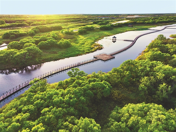 在黑瞎子島濕地公園,登上全景平臺(tái),游客可以一覽濕地全貌,體會(huì)親水、親綠、親近自然的愜意。2256米的漂浮式木棧道九曲回廊,浮筒的設(shè)計(jì)使浮橋水漲橋漲、水降橋降。