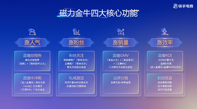 本次活動,快手磁力金牛和快手電商服務商也宣布推出一系列政策,推動常熟女裝商家電商生意增長。作為電商生意的加速器,快手磁力金牛讓商家投流更精準、效率更高、效果更好。在賬號啟動期,商家可借助磁力金牛進行私域起量,并根據(jù)貨盤制定營銷策略;在賬號成長期,商家可依據(jù)S-A-B直播策略模型,使用磁力金牛進行差異化投流、精細化運營;在賬號成熟期,磁力金??梢栽谄沸f(xié)同下進行差異化拓客,引入新流量。