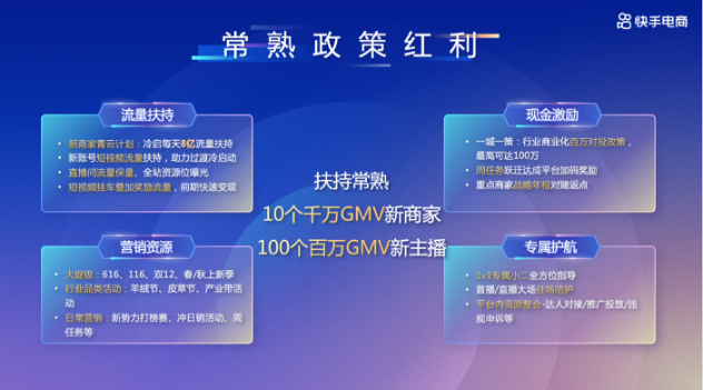 在流量扶持方面,新手常熟商家可享受“青云計劃”每天8億流量扶持,還有短視頻流量扶持、直播間流量保量、全站資源位曝光、短視頻掛車疊加獎勵等;在營銷資源方面,快手電商打造每月高頻的營銷場景,包括大促、節(jié)日、行業(yè)品類活動、寵粉節(jié)等,并為常熟商家提供活動補貼,激活品牌動銷;此外還有最高價值100萬的商業(yè)化對投政策、周任務躍遷達成平臺加碼獎勵等現(xiàn)金激勵,以及1V1專屬小二全方位指導等專屬護航。