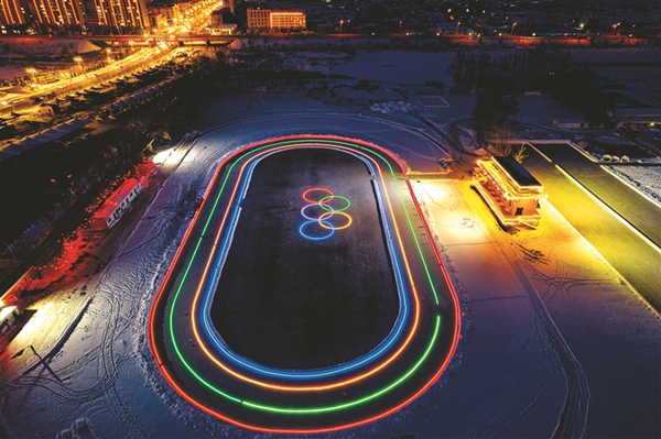 日前,雞西市橋北體育場大型燈光速滑冰場亮相并投入使用。冰場上,紅、綠、藍(lán)、黃四條光帶分隔的速滑賽道美麗且醒目。在冰場的中央,由五色光帶構(gòu)成的奧運(yùn)五環(huán)標(biāo)志清晰明亮,冰場四周懸掛了1000個(gè)小燈籠。燈光錯(cuò)落有致,色彩斑斕,吸引了大量市民加入到夜滑隊(duì)伍中。楊春光 本報(bào)記者 孫偉民攝