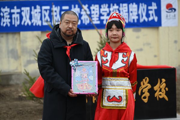 儀式中,農(nóng)豐滿族錫伯族鎮(zhèn)黨委書記李雪柏為張博先生頒發(fā)榮譽(yù)獎(jiǎng)牌,以及學(xué)生精心制作的手工禮物,表達(dá)真誠(chéng)的感激之情。