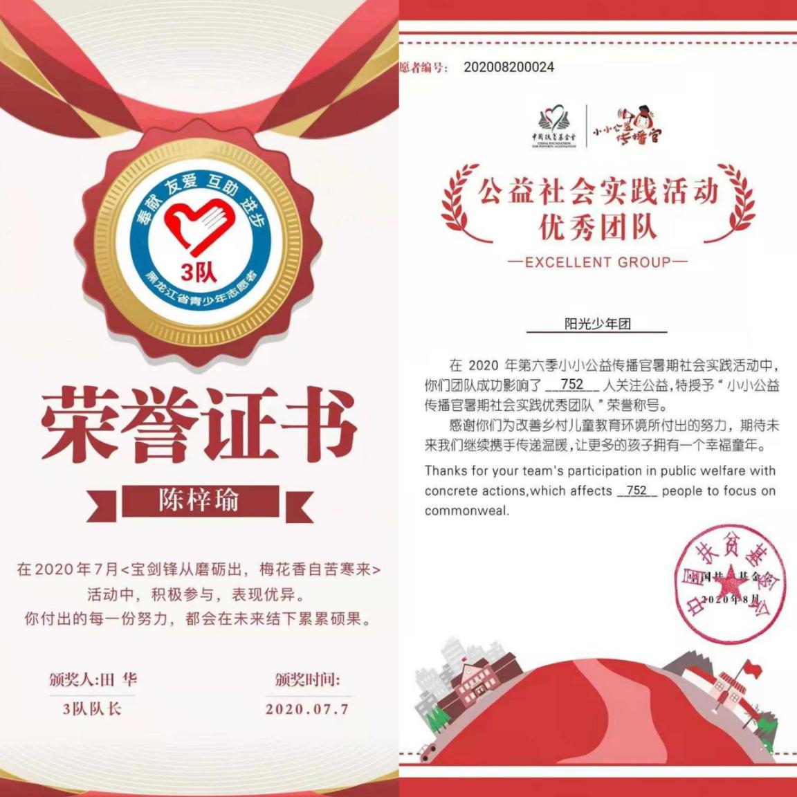 她在志愿服務(wù)中不怕苦不怕累,圓滿完成各項(xiàng)任務(wù),獲得各界一致好評,先后獲得省市(區(qū))的相關(guān)表彰,并被省幫扶中心授予“愛心少年”榮譽(yù)稱號。