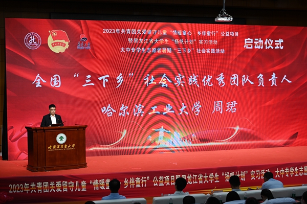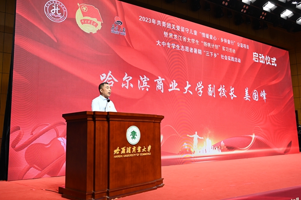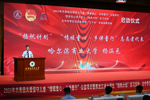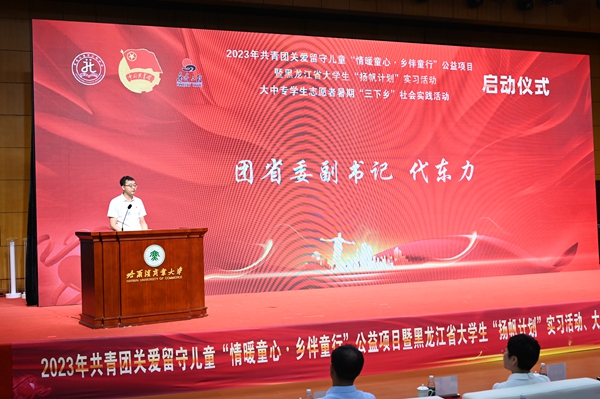 本次活動,在哈爾濱商業(yè)大學(xué)的大力支持下順利開展,哈爾濱商業(yè)大學(xué)副校長姜國鋒在儀式上致辭,他說:“學(xué)校建校71年來,立足立德樹人根本任務(wù),聚焦‘為黨育人,為國育才’的職責使命,在不斷加強‘第一課堂’建設(shè)的同時,還依托學(xué)?!惑w兩翼’文化育人模式,充分發(fā)揮實踐育人的作用,通過開展‘三下鄉(xiāng)’‘返家鄉(xiāng)’等社會實踐和‘西部計劃’‘興邊富民’志愿服務(wù)項目,引導(dǎo)廣大青年學(xué)生堅持用習(xí)近平新時代中國特色社會主義思想凝心鑄魂,在社會的課堂中‘受教育、長才干、作貢獻’?!被顒蝇F(xiàn)場,播放《黑龍江省希望工程30年與光同行》和黑龍江省大中專學(xué)生志愿者暑期“三下鄉(xiāng)”社會實踐活動宣傳片,與會領(lǐng)導(dǎo)上臺共同啟動了“情暖童心·鄉(xiāng)伴童行”公益項目、大學(xué)生“揚帆計劃”實習(xí)活動、大中專學(xué)生志愿者暑期“三下鄉(xiāng)”社會實踐活動。